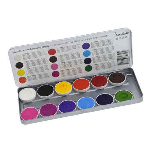 SuperStar Schminkpalette Sparkling Faces, 12 kleuren bevat de 12 door Svetlana Keller meest gebruikte kleuren. Deze water schmink kleuren dekken zeer mooi op de huid. En je kunt er geweldige effecten en designs mee maken.
