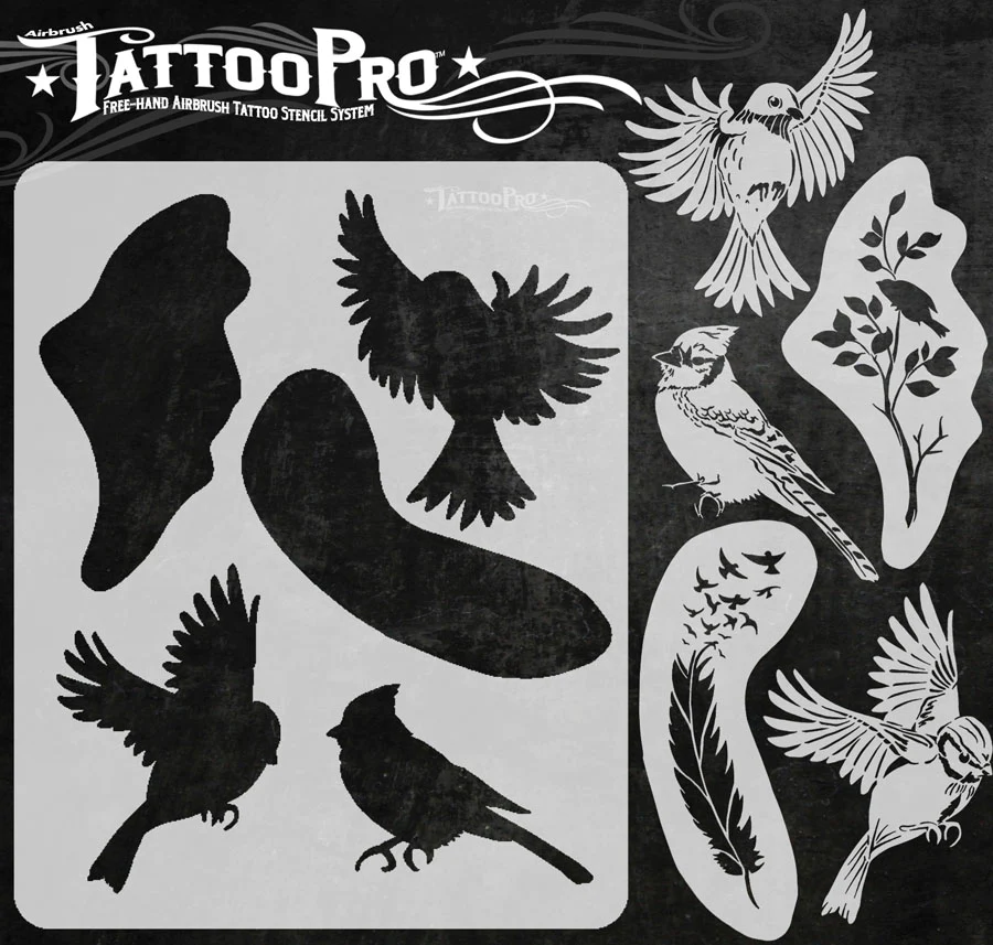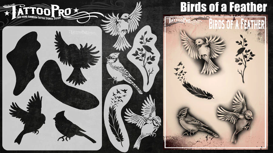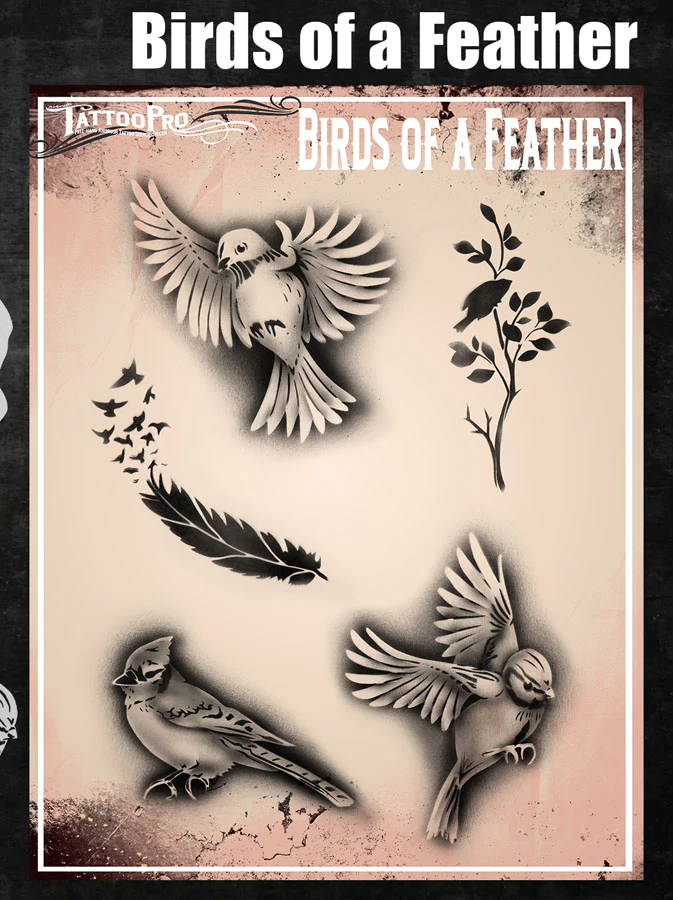 Wiser’s Airbrush TattooPro Stencil – Birds of a Feather zijn Airbrush sjablonen speciaal ontworpen door Bodypaint en Graffiti artist Wiser Oner. Van de sjablonen kun je zowel de positieve als de negatieve delen gebruiken, als je ze uit het vel drukt. Eindeloos te combineren met de andere TattooPro stensils, zodat er iedere keer weer een originele Airbrush Tattoo ontstaat.