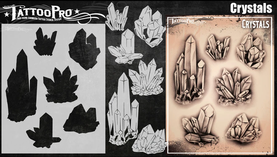 Wiser’s Airbrush TattooPro Stencil – Crystalszijn Airbrush sjablonen speciaal ontworpen door Bodypaint en Graffiti artist Wiser Oner. Van de sjablonen kun je zowel de positieve als de negatieve delen gebruiken, als je ze uit het vel drukt. Eindeloos te combineren met de andere TattooPro stensils, zodat er iedere keer weer een originele Airbrush Tattoo ontstaat.