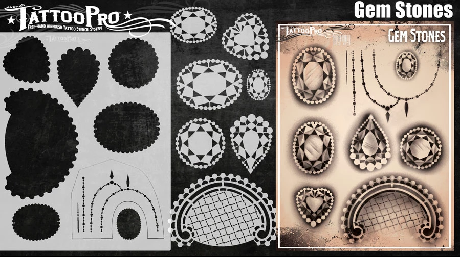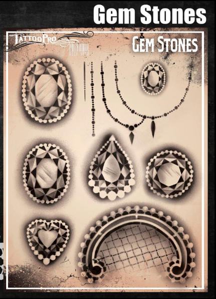 Wiser’s Airbrush TattooPro Stencil – Gemstoneszijn Airbrush sjablonen speciaal ontworpen door Bodypaint en Graffiti artist Wiser Oner. Van de sjablonen kun je zowel de positieve als de negatieve delen gebruiken, als je ze uit het vel drukt. Eindeloos te combineren met de andere TattooPro stensils, zodat er iedere keer weer een originele Airbrush Tattoo ontstaat.