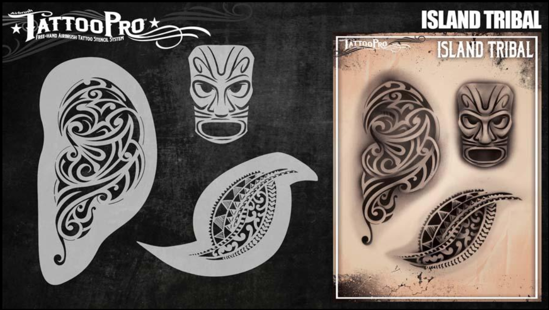 Wiser’s Airbrush TattooPro Stencil – Island Tribal zijn Airbrush sjablonen speciaal ontworpen door Bodypaint en Graffiti artist Wiser Oner. Van de sjablonen kun je zowel de positieve als de negatieve delen gebruiken, als je ze uit het vel drukt. Eindeloos te combineren met de andere TattooPro stensils, zodat er iedere keer weer een originele Airbrush Tattoo ontstaat.