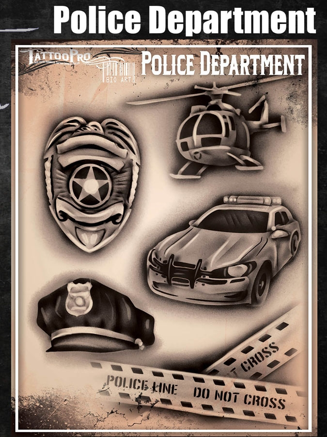 Wiser’s Airbrush TattooPro Stencil – Police Departmentzijn Airbrush sjablonen speciaal ontworpen door Bodypaint en Graffiti artist Wiser Oner. Van de sjablonen kun je zowel de positieve als de negatieve delen gebruiken, als je ze uit het vel drukt. Eindeloos te combineren met de andere TattooPro stensils, zodat er iedere keer weer een originele Airbrush Tattoo ontstaat.